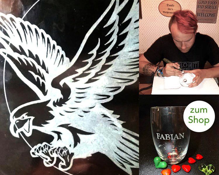 Mit hochwertigem Diamantwerkzeug bringen wir Ihre Wünsche in detailgetreuer Handarbeit auf Glas. Ob prächtige Motive oder effektvolle Schriftzüge, wir verwirklichen Ihre Wünsche und Ideen!